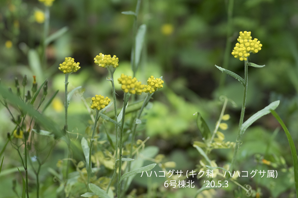 ハハコグサ:キク科の越年草で道端や畑に見られる身近な草である。全体が白い毛で覆われていて白っぽく見え、春から初夏にかけて黄色い小さな花を密につける。