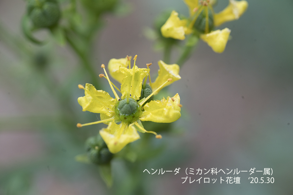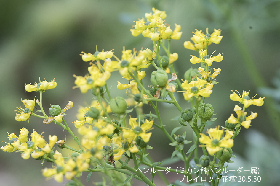 ヘンルーダ:ミカン科の常緑低小木で名前はオランダ語に由来する。江戸時代に渡来し、葉に含まれるシオネールという精油成分が薬用や防虫剤として用いられた。