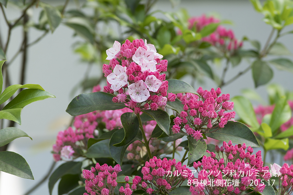 カルミア:コンペイトウに似た蕾から赤やピンク、白、紫色の花を咲かせる常緑の低木で高さは0.2~5mになる。蕾と花の色の対比がさまざまに変化する園芸品種がある。