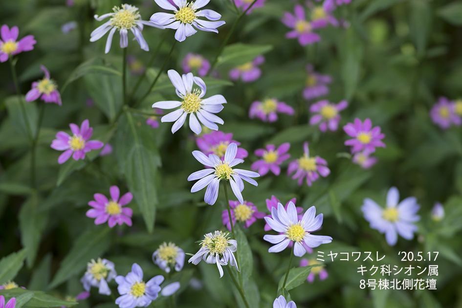 ミヤコワスレ:ミヤマヨメナの園芸品種。承久の乱で敗れて佐渡に流された順徳上皇は白い菊を植えて都を忘れようとした。その白い菊がミヤマヨメナで、その園芸種の花変わりして紫やピンクになった花にミヤコワスレという名を付けたのが名前の由来。