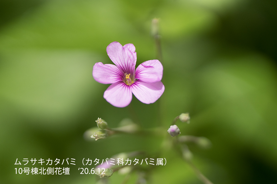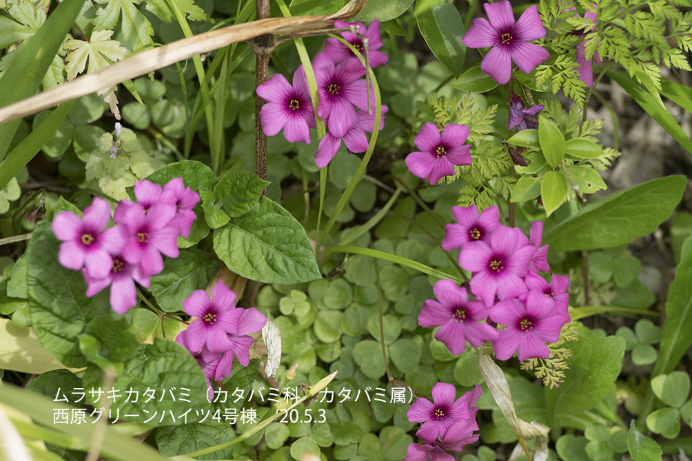 ムラサキカタバミ:カタバミより大きく紫の花を付ける。南アメリカ原産であるが江戸時代末期に移入されてから日本中に広まっている。