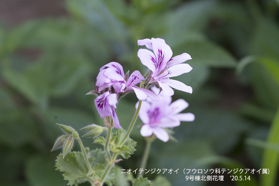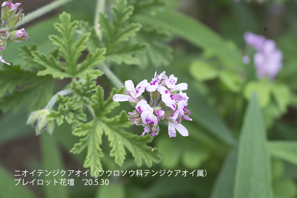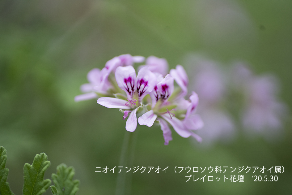 ニオイテンジクアオイ:南アフリカ原産の常緑低小木で茎葉にバラのような芳香を持つ。水蒸気蒸留して得られる精油には「ゼラニウム油」と呼ばれ、香料などとして用いられる。(Wekipediaより引用)