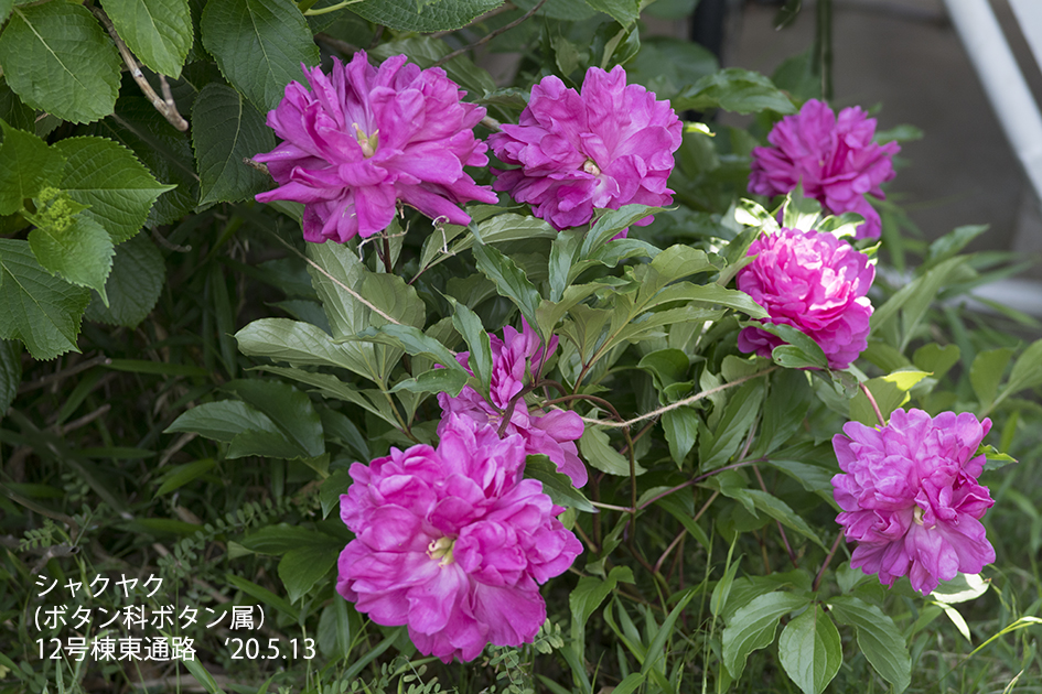 シャクヤク:ボタンが樹木であるのに対して、シャクヤクは草本である。高さは約60 cm。根は赤褐色から褐色の紡錘形、十数本が横走する。茎は毎春数本が直立し、数枚の葉を互生する。下部の葉は2回3出複葉、しばしば2 – 3裂し、葉脈と葉柄は赤色を帯びる。上部の葉は簡単になる。