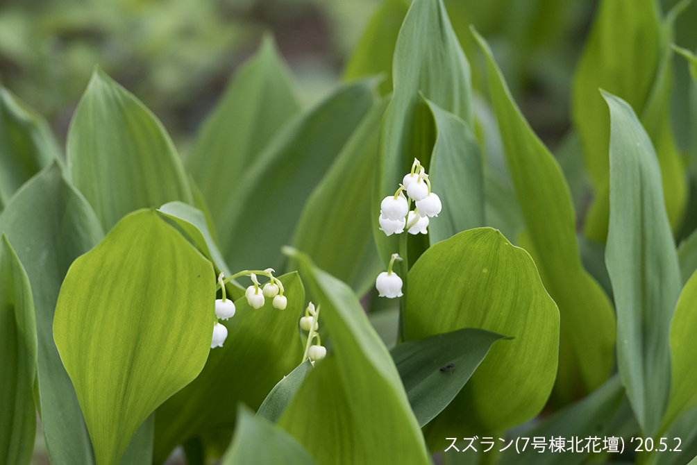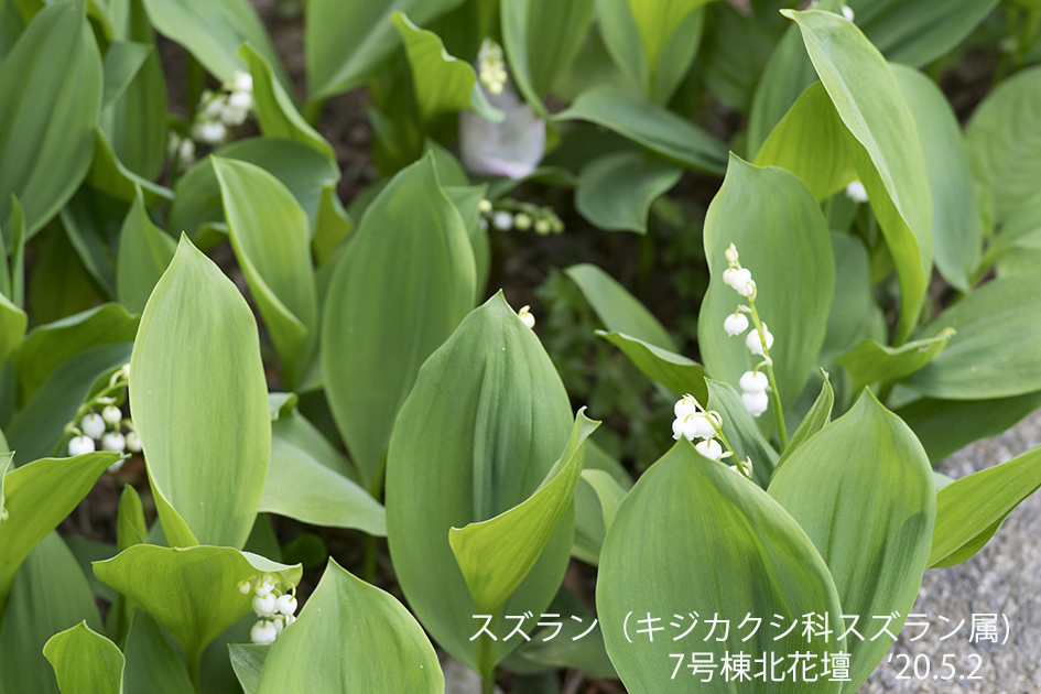 スズラン:春を知らせる代表的な花。写真のスズランは背が低く花も葉の間に隠れて咲く日本在来種。ドイツスズランは背が高く、花は葉よりも上の高さで咲く。—画像をクリックすると拡大します—