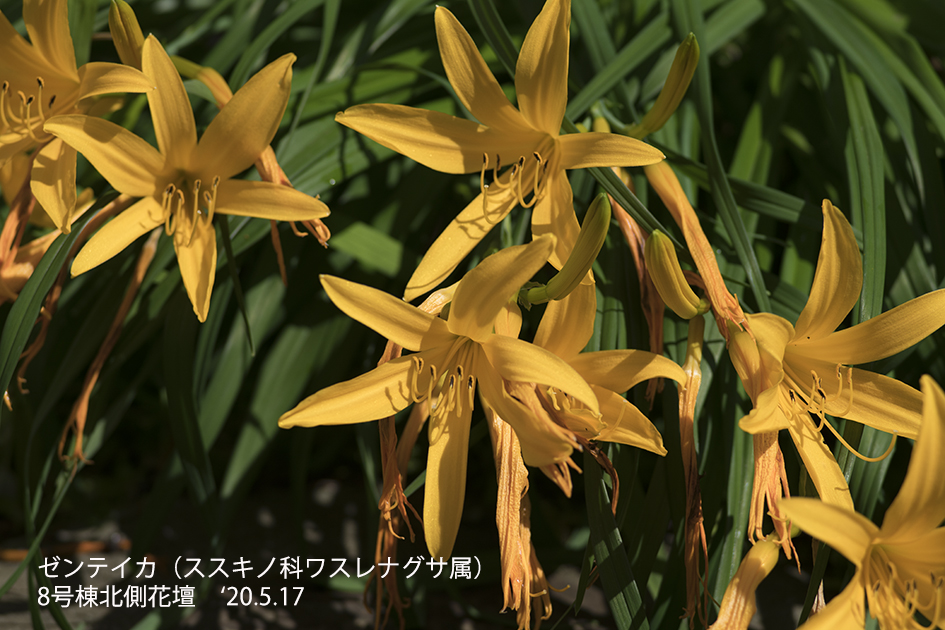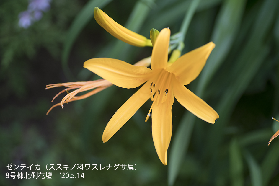 ゼンテイカ:禅庭花と書くがニッコウキスゲの名前で呼ばれることが多い。日光の霧降高原、尾瀬ヶ原、霧ヶ峰などの群落が有名である。群生すると山吹き色の絨毯のようになり綺麗である。朝方に開花し夕方には萎んでしまうが種類によっては翌日まで開花しているものもある。
